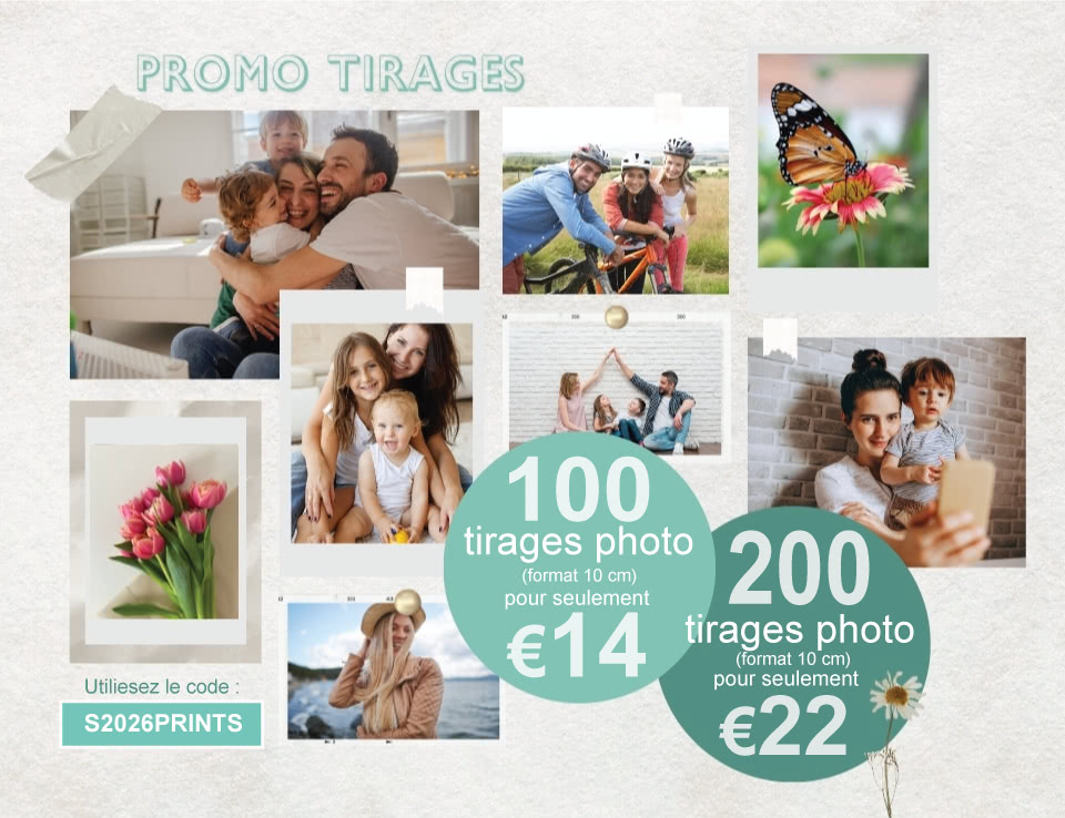 La promo tirages photo est valable du 23 février jusqu'au 31 mars 2026 à la commande d'un min. de 100 tirages photo format 10 cm type classic ou standard, carré, noir-blanc et avec bord blanc avec le code promo S2026PRINTS. Non-valable pour les tirages rétro, éco en panomarique. Prix excl. frais d'amorçage. Non-cumulable avec d'autres promotions.